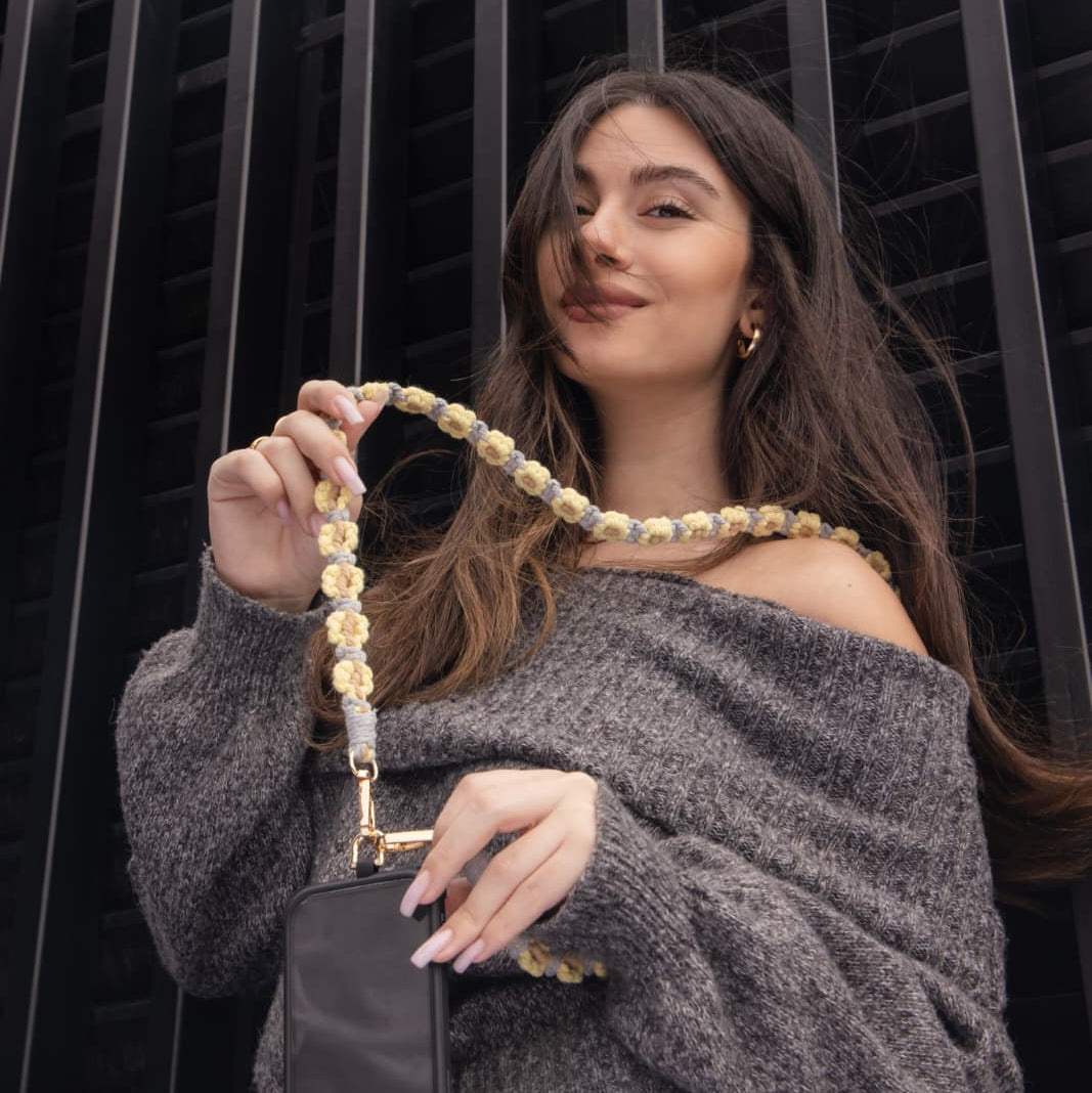 Wear it over your shoulder or replace your purse strap with it to give your look a whole new touch! 🌼 Our long crochet flower strap adds instant cuteness to any outfit and can easily be swapped for another color to match your vibe. 💕